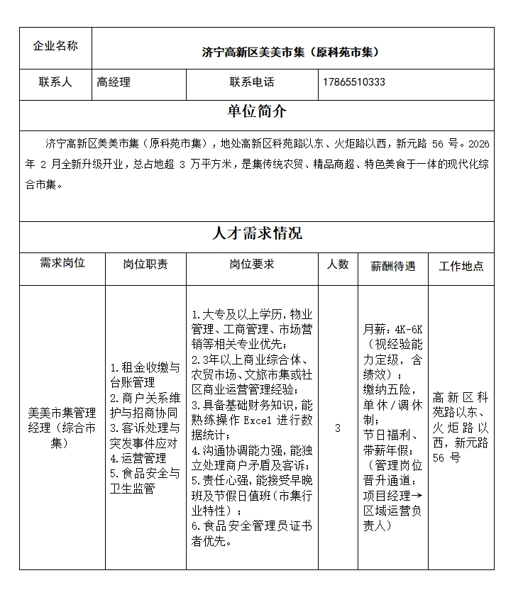 濟(jì)寧高新區(qū)美美市集(原科苑市集)招聘簡章